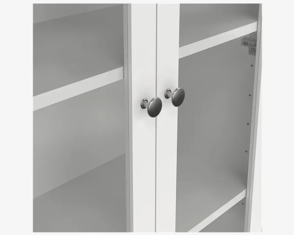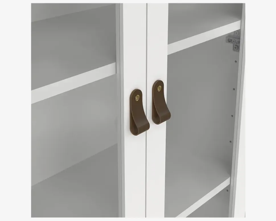 Vitrine i hvid kunstfiner. Vitrinen har 2 glaslåger og 3 skuffer, og er fremstillet i country style, så den passer perfekt ind i det store landkøkken, men kan også sagtens bruges i stuen eller spisestuen. Bag dørene gemmer sig tre hylder. Du bestemmer selv udtrykket, vitrinen leveres med 2 slags greb, et i læder, samt en knop i antik stål. Vitrinen leveres usamlet, men hvis du følger den vedlagte samlevejledning, samles den uden problemer. Vi anbefaler altid at I er to om at flytte vitrinen på plads, så I undgår skader på gulvet eller møblet. Møblet aftørres med en klud vredet op i rent vand, og kræver ingen vedligeholdelse.