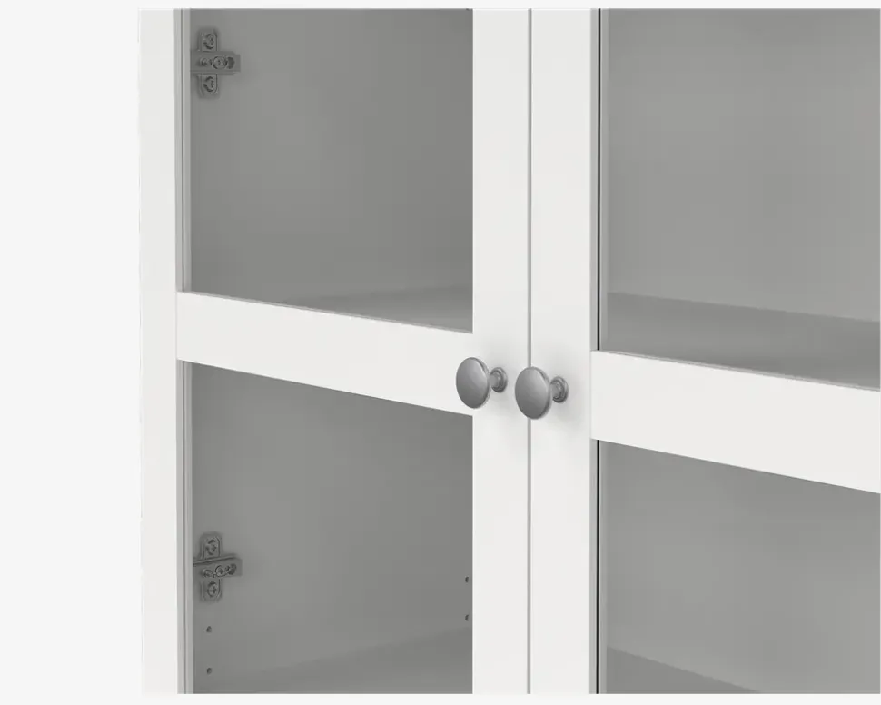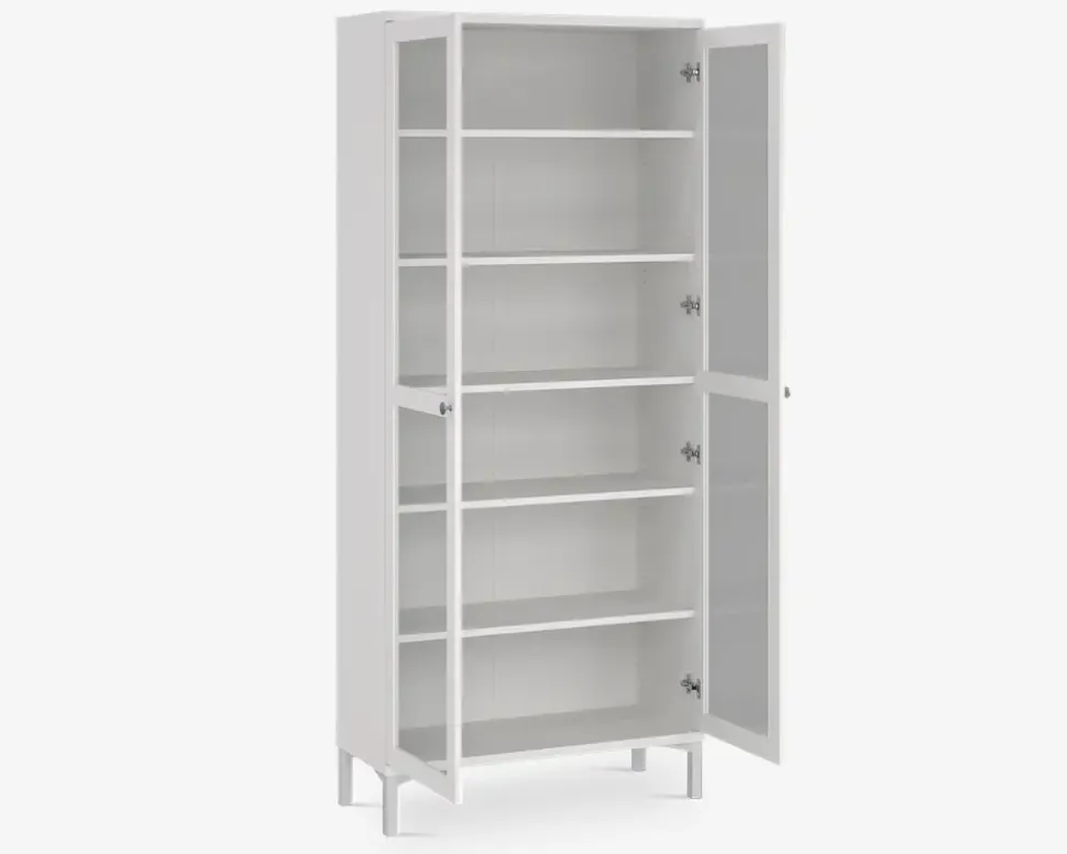 Flot vitrine i hvid kunstfiner, som giver dig masser af opbevaringsplads, hvad enten det er til det praktiske, eller du ønsker at udstille dekorationsting fra hjemmet på en flot måde.Vitrinen er fremstillet i hvid kunstfiner, og er inklusiv 5 hylder, hvoraf den midterste er fast, mens de øvrige 4 kan justeres en smule. Hver hylde kan bære op til 10 kg.Vitrinen leveres usamlet, men samles uden problemer, hvis den medfølgende samlevejledning følges. Vi anbefaler at I er to når vitrinen skal samles og sættes på plads, samt at den fastgøres til væggen med de medfølgende vinkelbeslag. Vitrinen kræver ingen vedligeholdelse, og aftørres med en klud vredet op i rent vand.