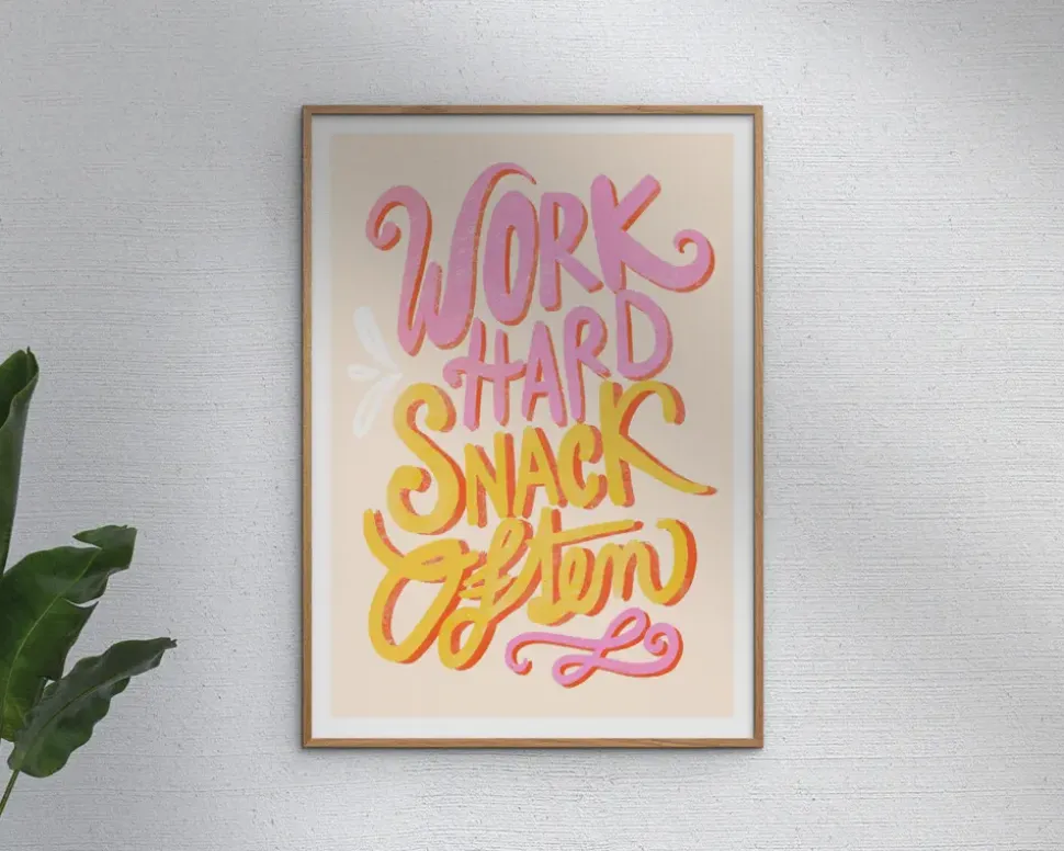 Dekorativt billede med teksten “Work Hard Snack Often” i A5-format. Billedet kombinerer motivation og humor med et enkelt og moderne design. Perfekt til kontoret, køkkenet eller som en sjov del af en billedvæg.